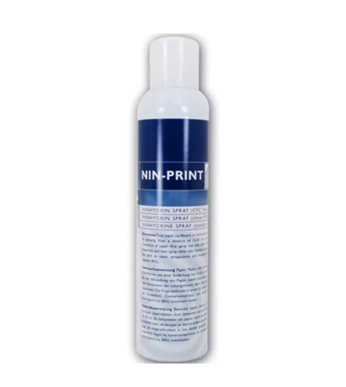 NIN-PRINT,我們新氣溶膠茚三酮溶液,是制定有關在犯罪現場發現的各種紙張潛在指紋的理想方式。 NIN-PRINT會作出反應,當發現氨基酸和蛋白質的潛在指紋時,加熱會變成紫色。250毫升噴霧罐裝,簡便的噴霧乾燥速度快,且無氟。它會發現潛在指紋,而不會導致油墨溢出。