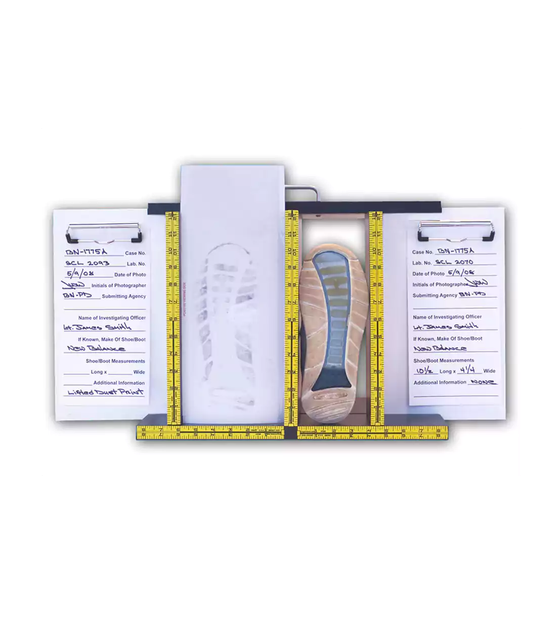 這款鞋/啟動相片架的開發是為了在直立位置,以協助犯罪實驗室人員從採集的嫌疑拍攝和考試鞋類鞋類舉行。支架也可用於從犯罪現場比較所收集的鞋類鑄件或解除灰塵打印。 這一立場是由0.75“木覆蓋著粉嫩的黑色層壓板和措施18”長x12“寬x14”高,重量16.6磅。 這兩種白色的滑動面板鎖定到位鞋類,以及粉嫩,預印照片信息卡可以方便地連接到通過彈簧加載的卡夾面板。這些卡可以讓你記錄有關使用快乾的照片,所有相關信息,氈尖筆。 五十照片信息卡和氈尖筆都配有支架。 雖然支架被用於鞋類開發的,它可用於拍攝的各種其他類型的證據的為好。