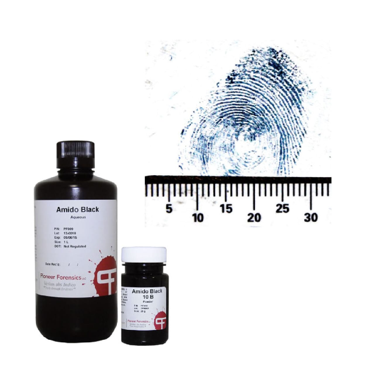 阿米多黑(Amido Black) 用於 增強被血液污染的潛在指紋,但無法成功顯現 以汗液為基礎的指紋。雖然它無法檢測典型的潛在指紋化學成分,但對 血液和某些其他體液中的蛋白質 非常敏感。該試劑會留下 藍黑色染色,可適用於 多孔性及非多孔性表面。