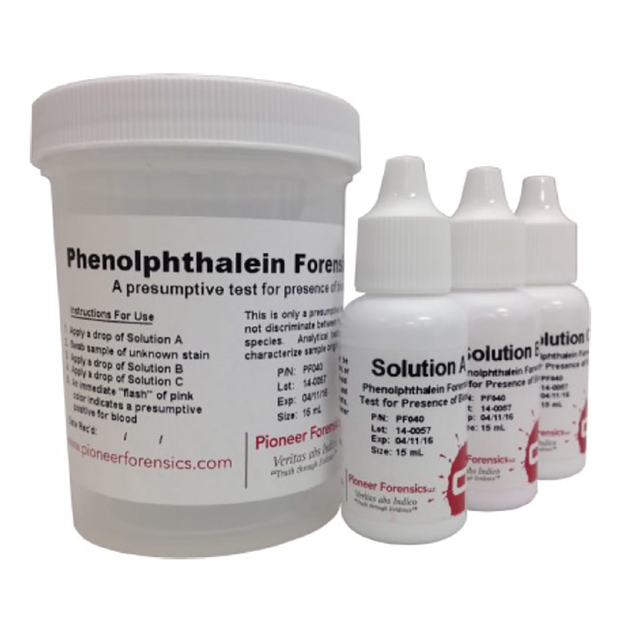 酚酞(Phenolphthalein) 是 實驗室及現場最常用的化學試劑之一,可用於 初步篩檢血液。我們的 預包裝測試套件 含有 所有試劑,可進行 初篩血液測試。此 簡單的 4 步驟測試 易於操作,並存放於 小型塑膠杯內。